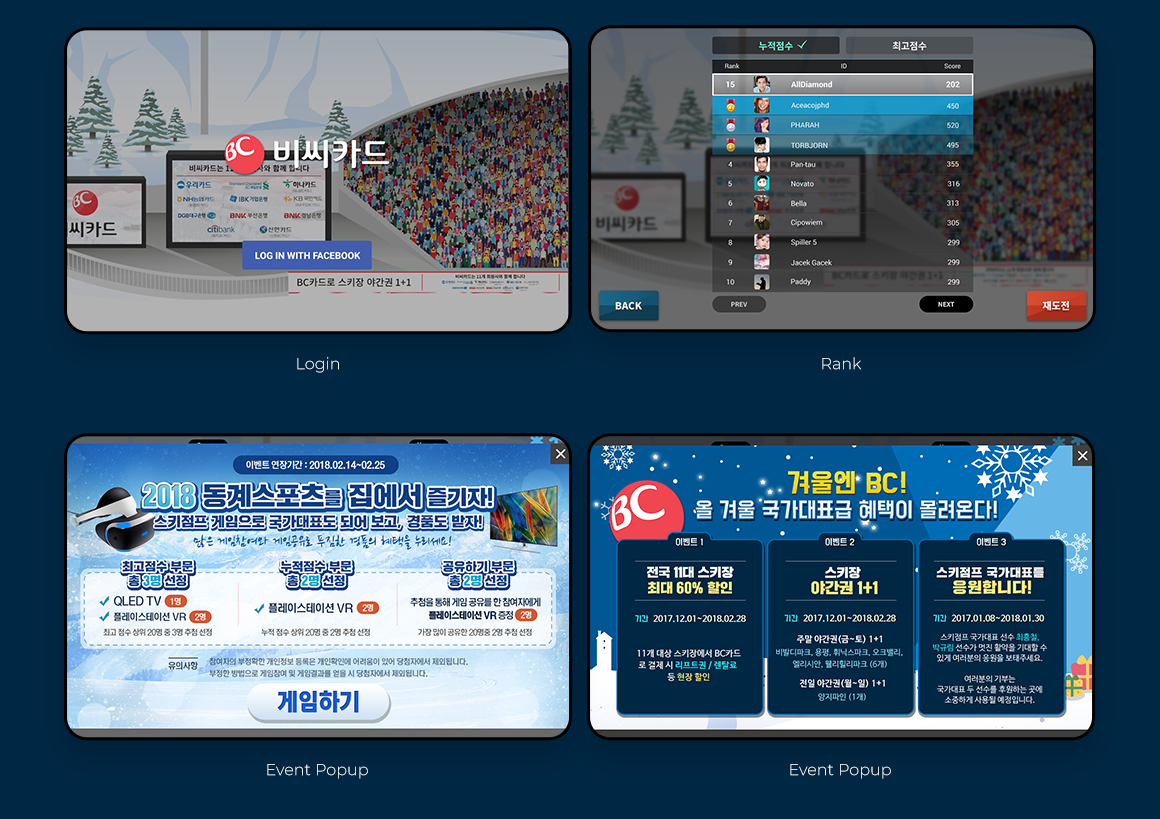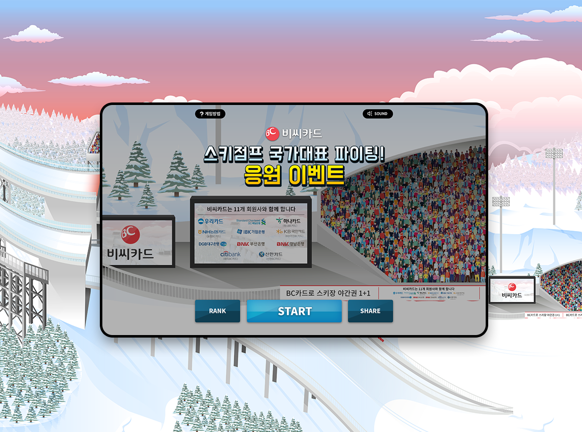 2018년 동계 올림픽 시즌에 진행하게 된 비씨카드사의 "스키점프 국가대표 파이팅! 응원 이벤트"의 UI 및 마케팅 배너 작업을 진행하였습니다.
