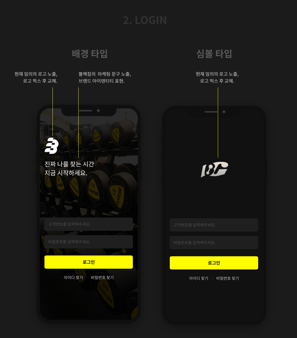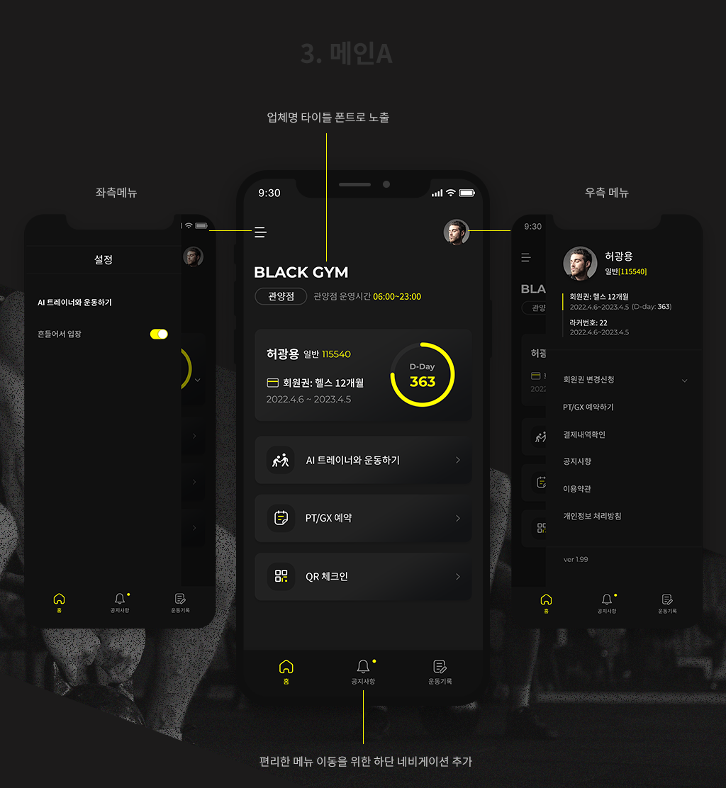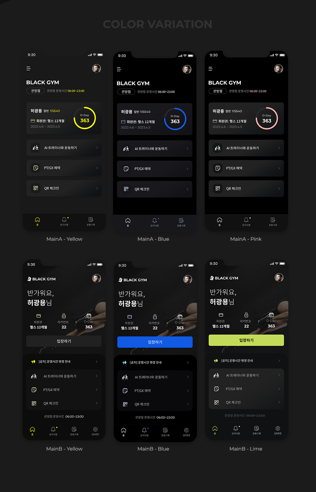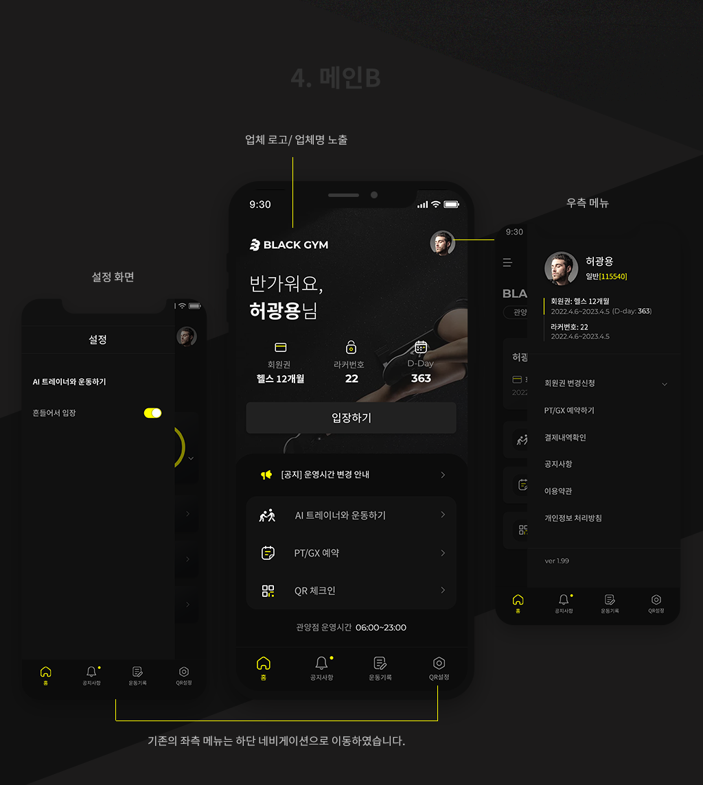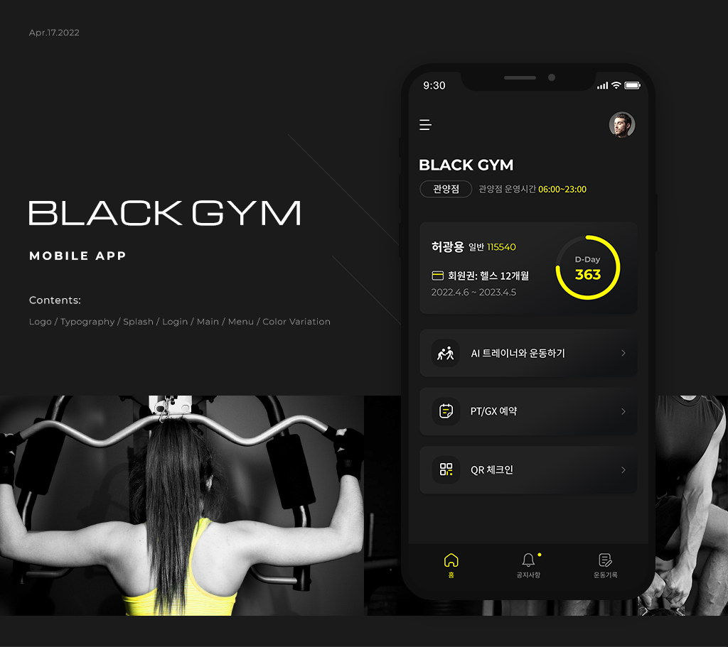 블랙짐 헬스 프랜차이즈의 예약관리 앱, 로고, 관리자 페이지의 디자인 작업을 진행했습니다. 아래는 클라이언트에게 제시한 컨셉 시안입니다.