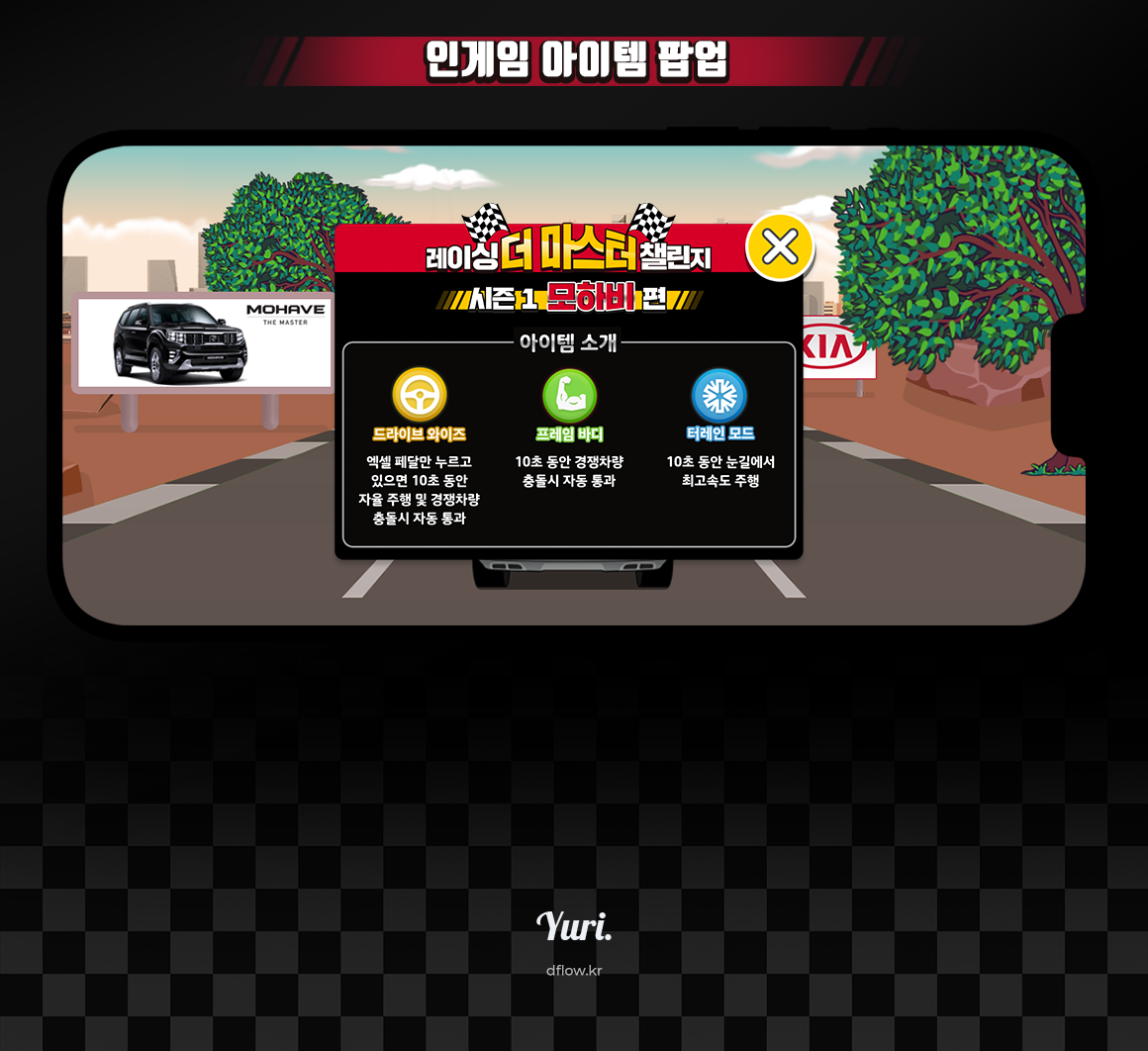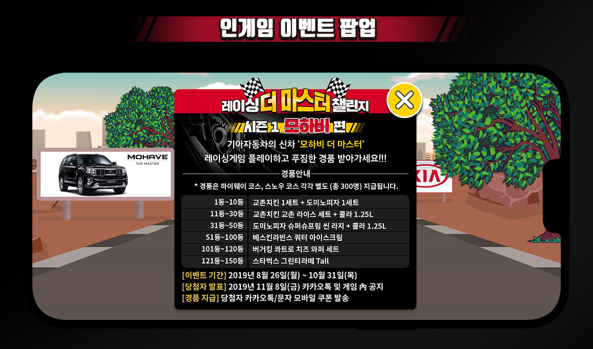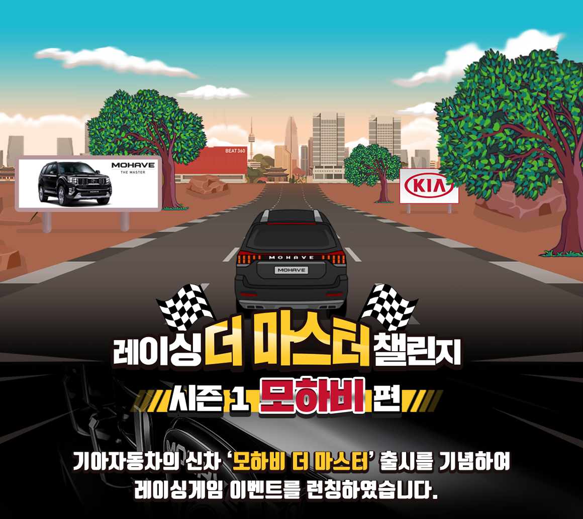 기아자동차에서 런칭한 "레이싱 더 마스터 챌린지" 게임의 이벤트 랜딩페이지와 인게임 팝업 디자인 작업을 진행하였습니다.