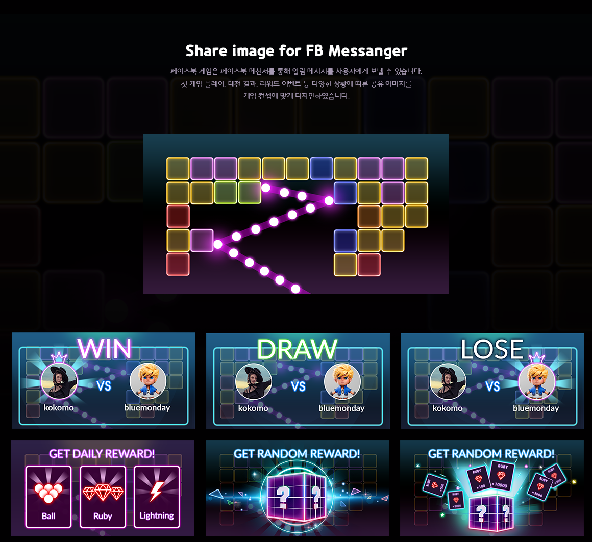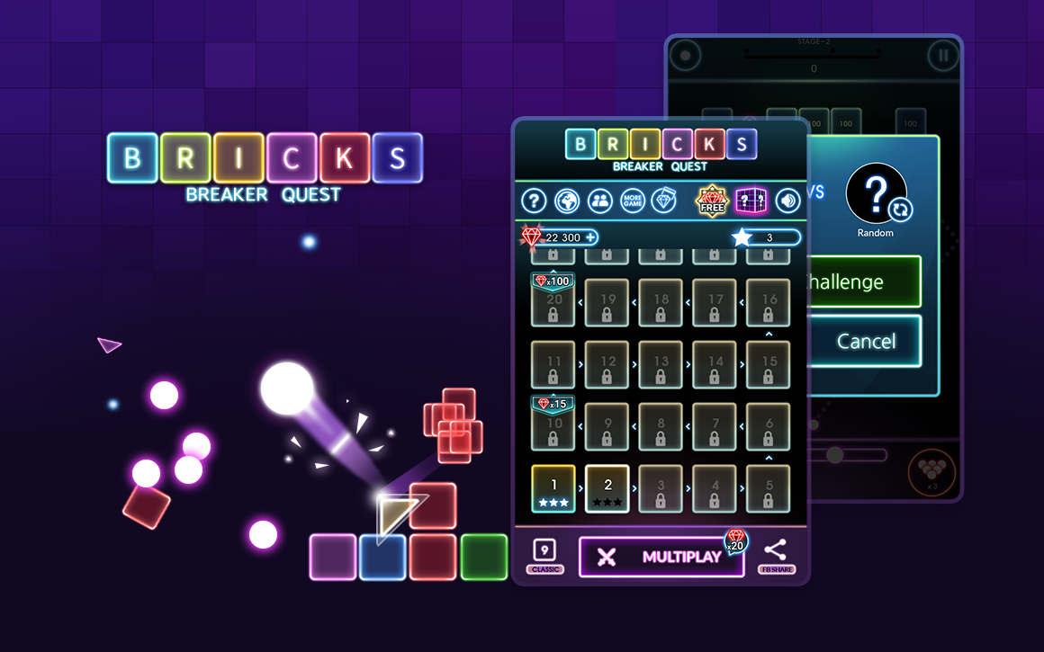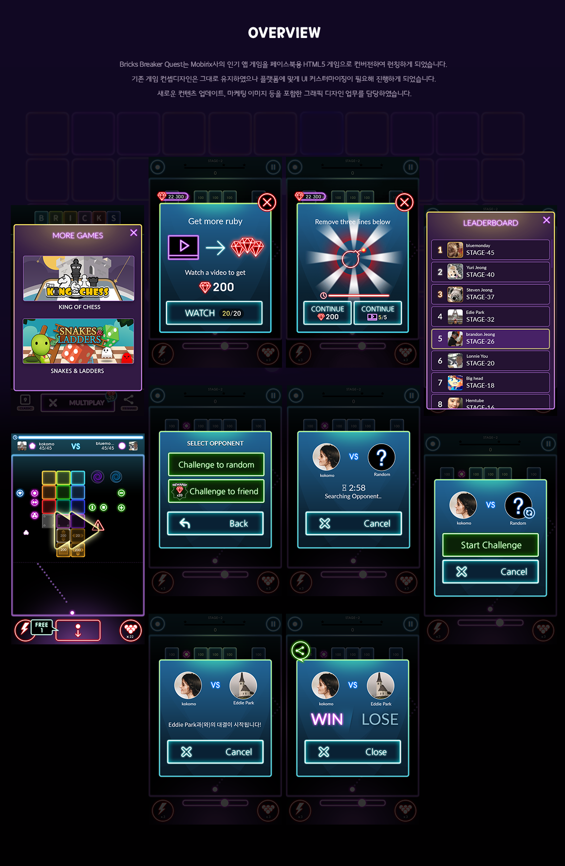 Bricks Breaker Quest 앱 게임을 페이스북 게임에 런칭하기 위하여 플랫폼에 맞는 UI 커스터마이징과 컨텐츠 업데이트 및 마케팅 이미지 작업을 진행하였습니다.