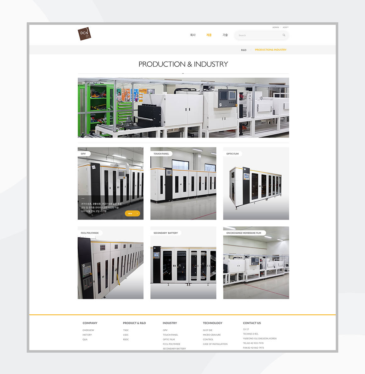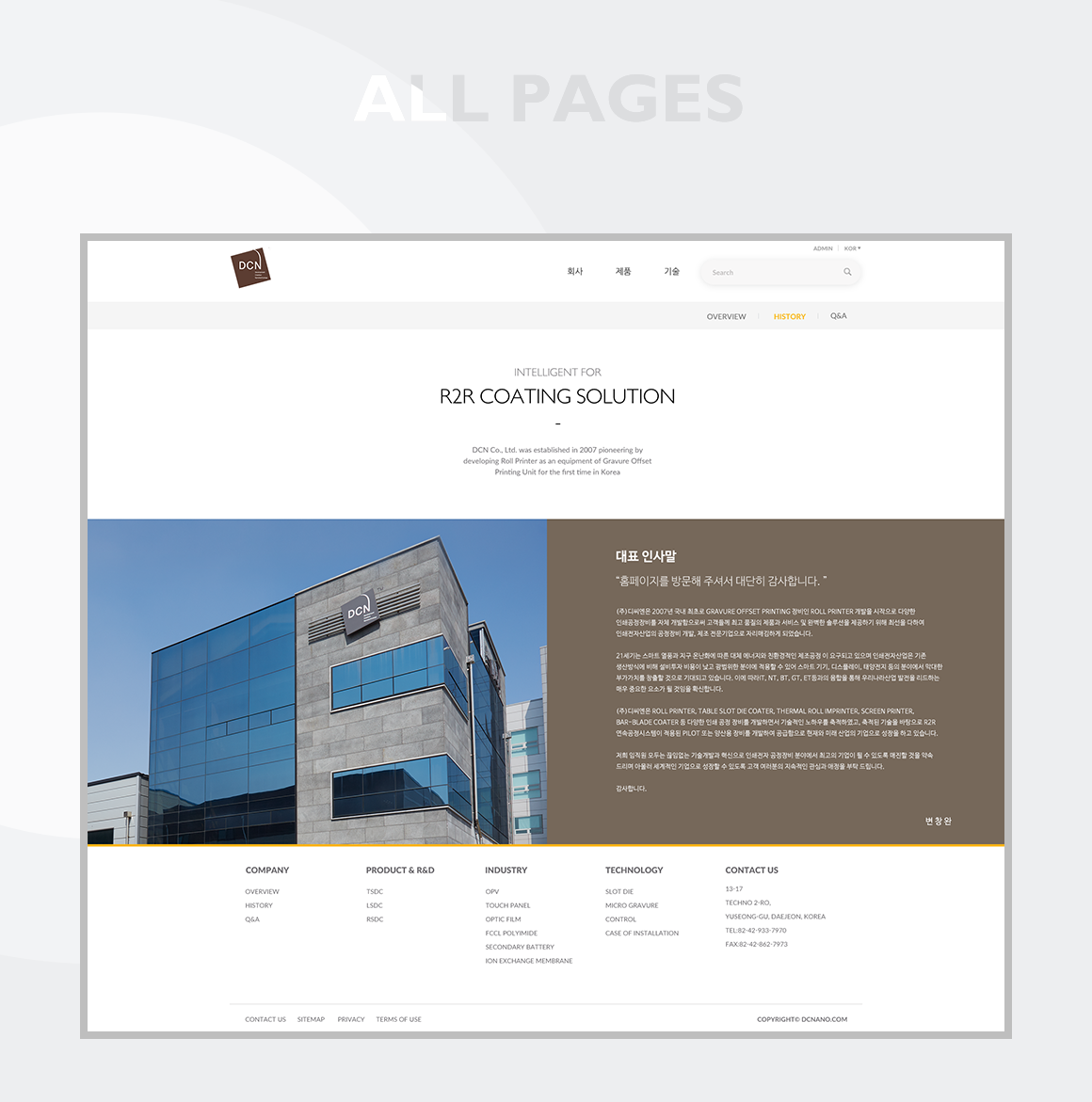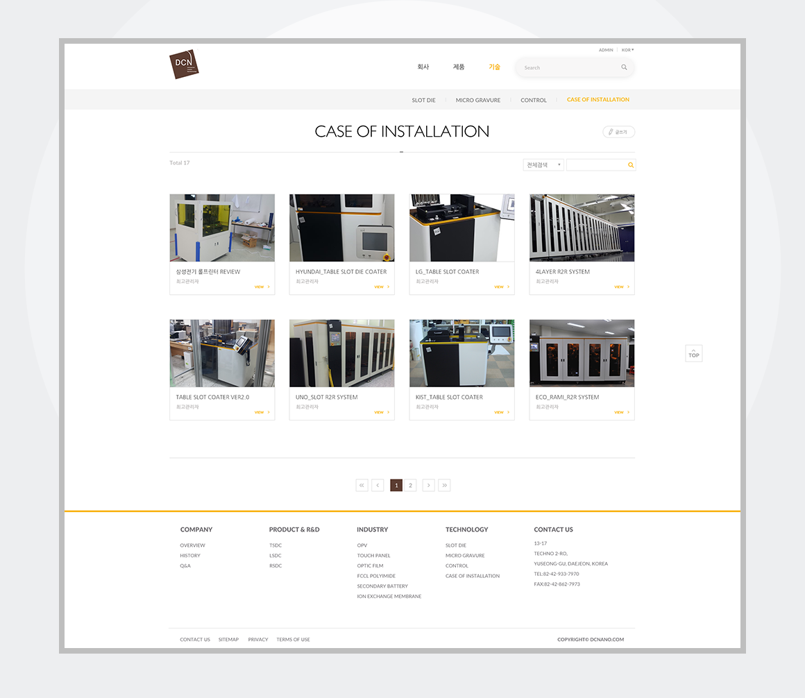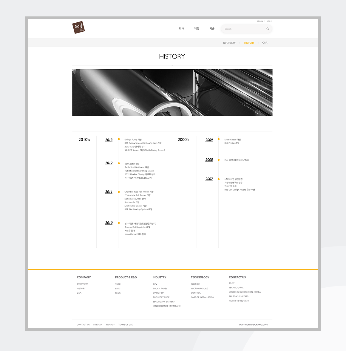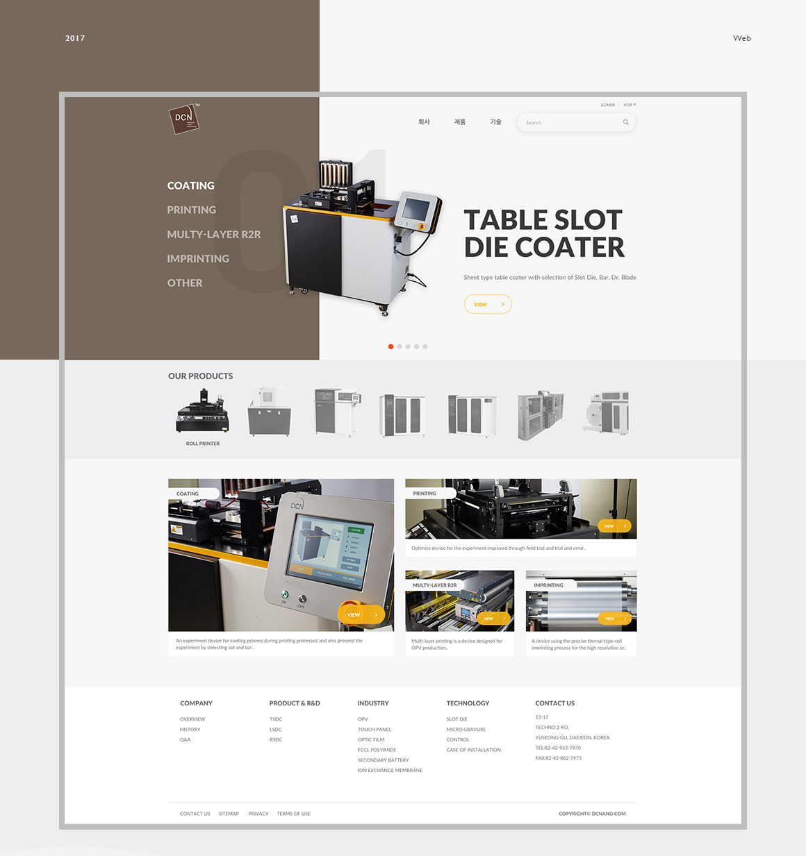 인쇄장비 개발회사인 DCN의 공식 홈페이지의 전체 디자인 작업을 진행하였습니다. 부드러운 브라운 톤의 로고와 젊은 이미지의 회사 사옥에서 영감을 받아 감성적인 느낌의 홈페이지로 재탄생했습니다.