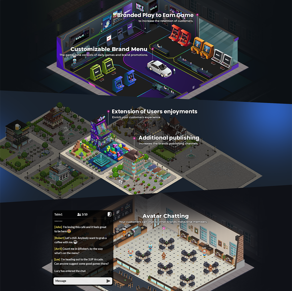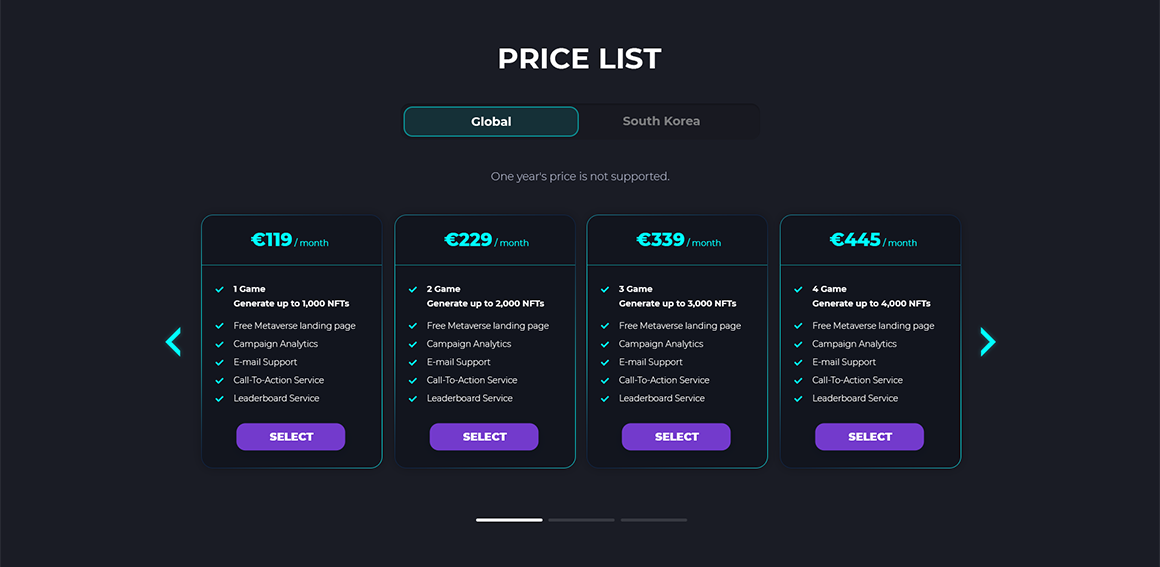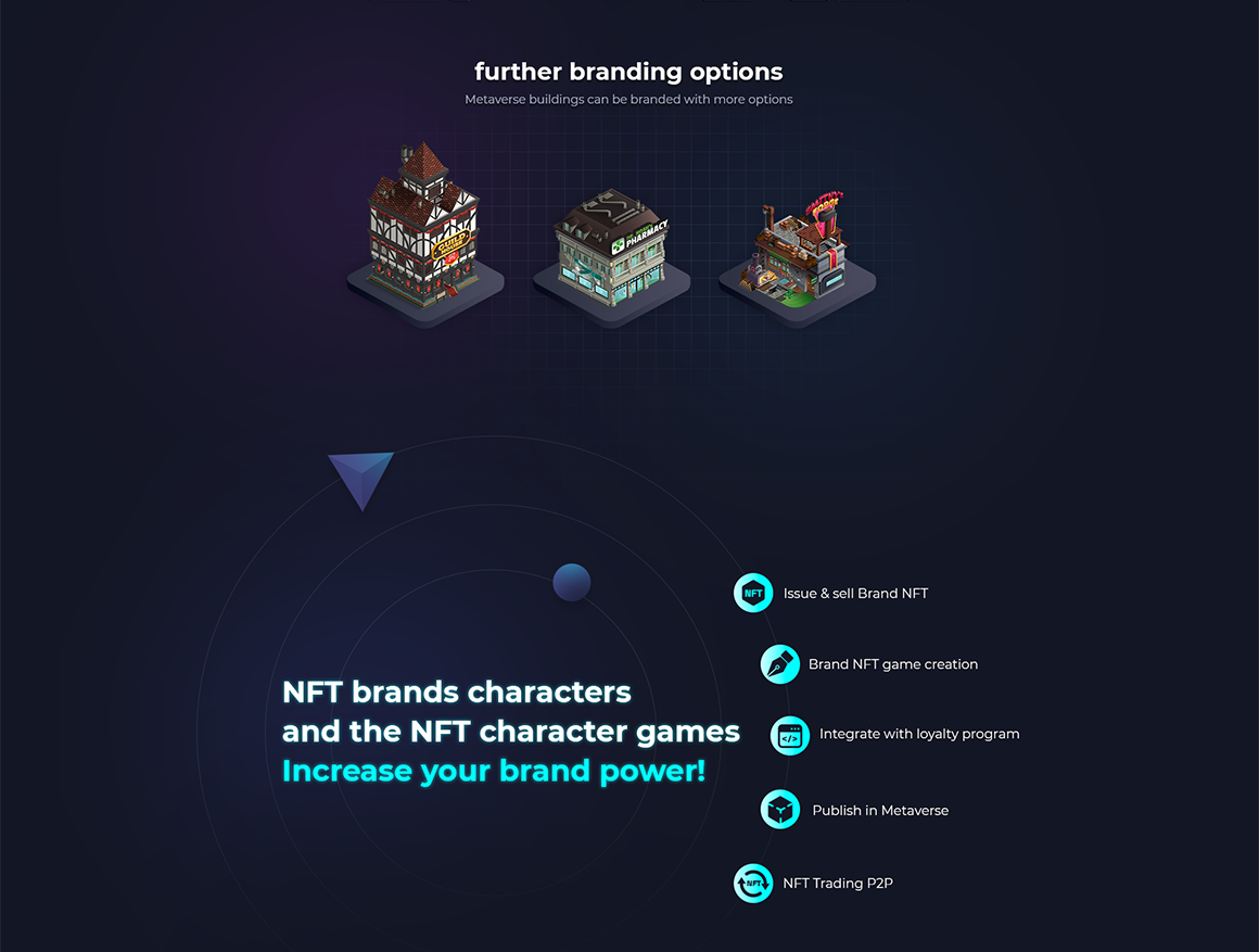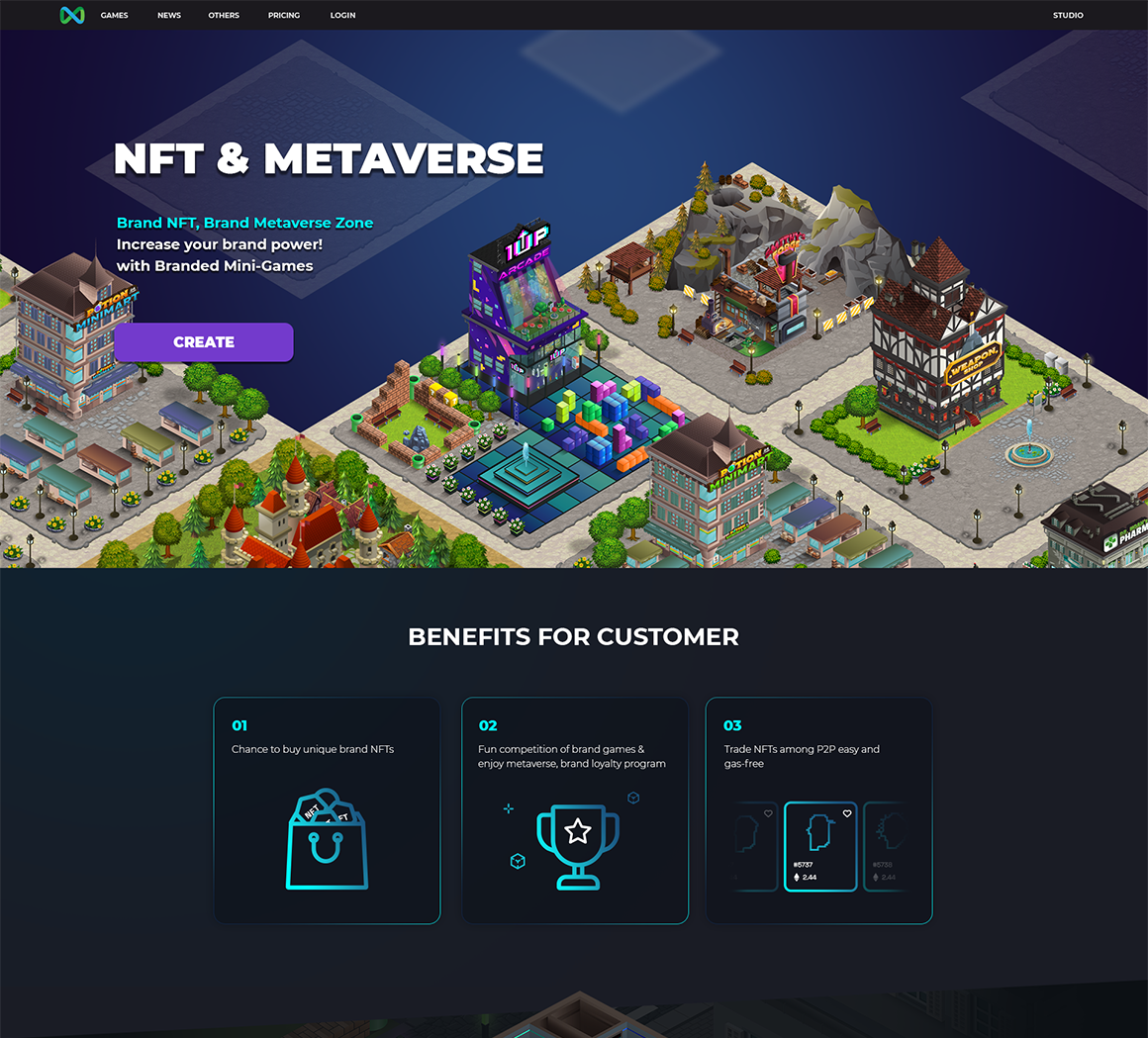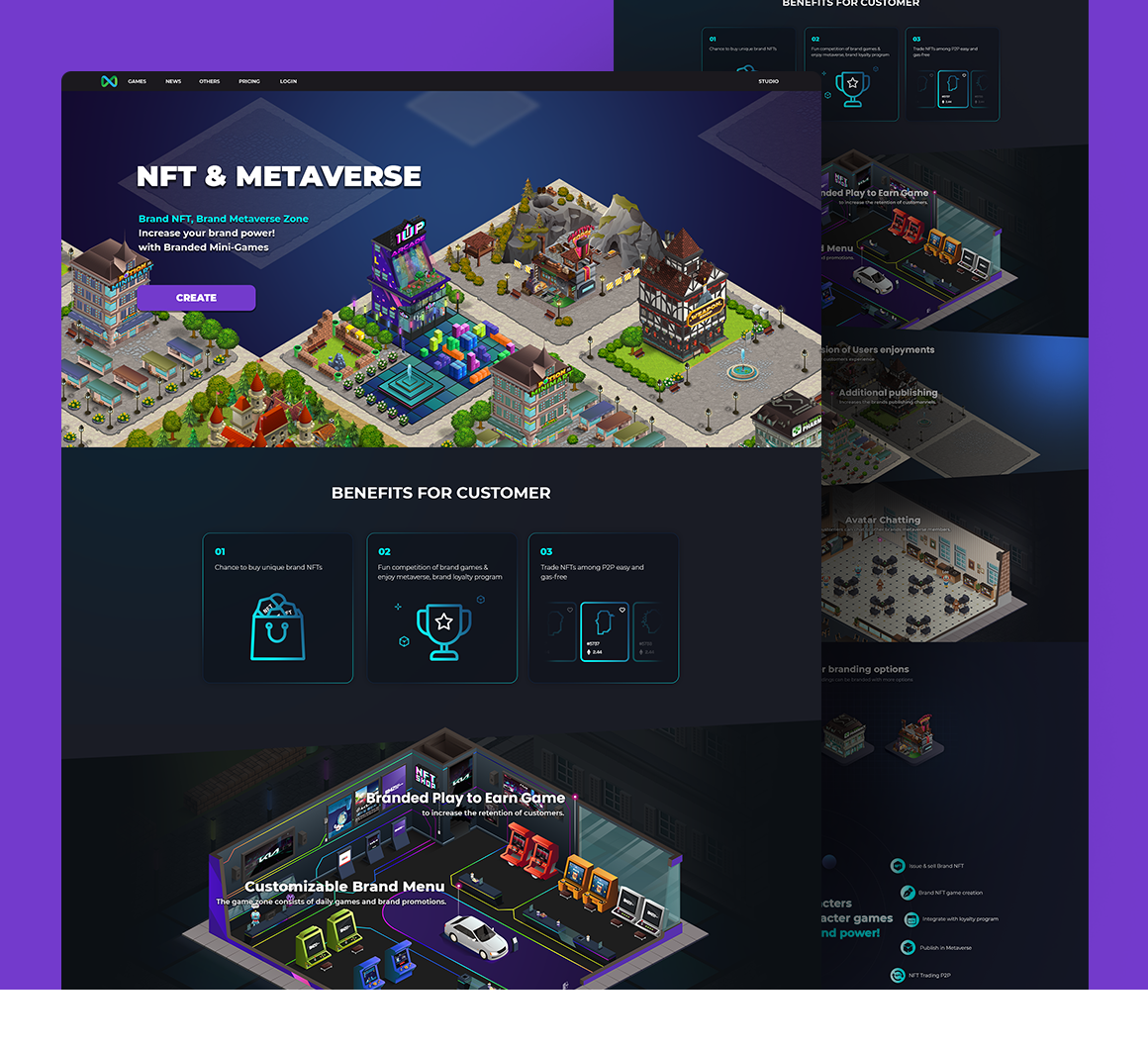 "브랜드 메타버스 프로덕션 서비스" 랜딩 사이트의 디자인 작업을 진행했습니다. (브랜드 메타버스 존 그래픽 리소스 활용)