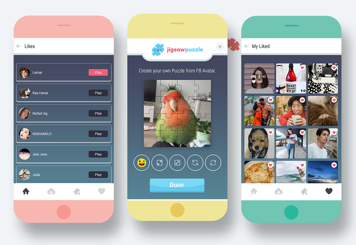 페이스북 게임에 런칭한 Jigsaw Puzzle 게임의 전체 UI 디자인 작업을 진행하였습니다. 플랫하고 귀여운 느낌의 디자인 컨셉으로 유저들의 사진이 더 돋보일 수 있도록 아이콘과 인터페이스는 무채색과 최대한 심플한 디자인을 배치했습니다.