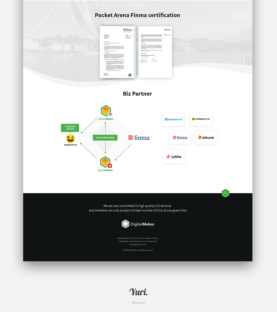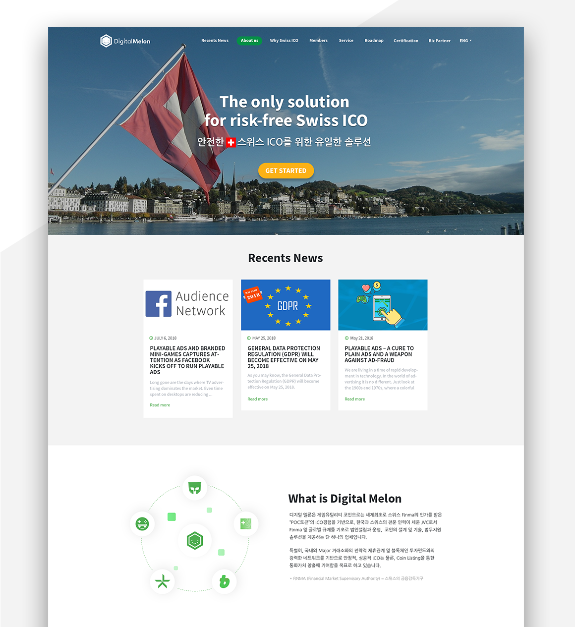 디지털 멜론 사이트 전체 디자인 작업을 진행했습니다. 신뢰감을 줄 수 있는 그린 컬러와 그레이 컬러를 사용하였고 스위스의 국기가 포함된 자연경관의 이미지를 메인에 배치하여 시원하고 차분한 이미지를 유도하였습니다.