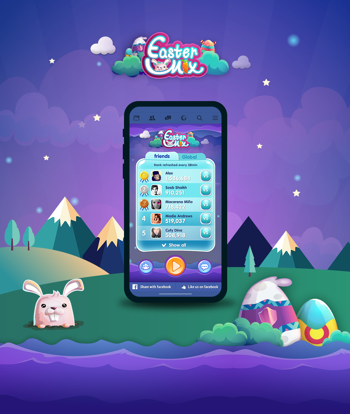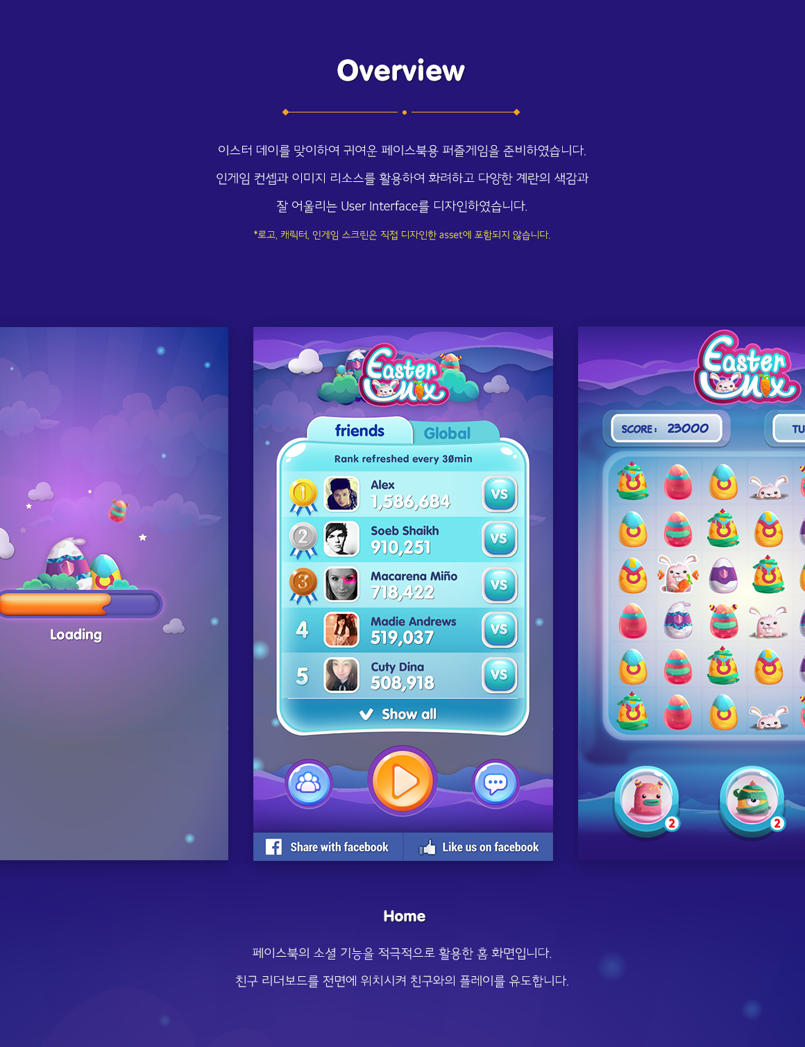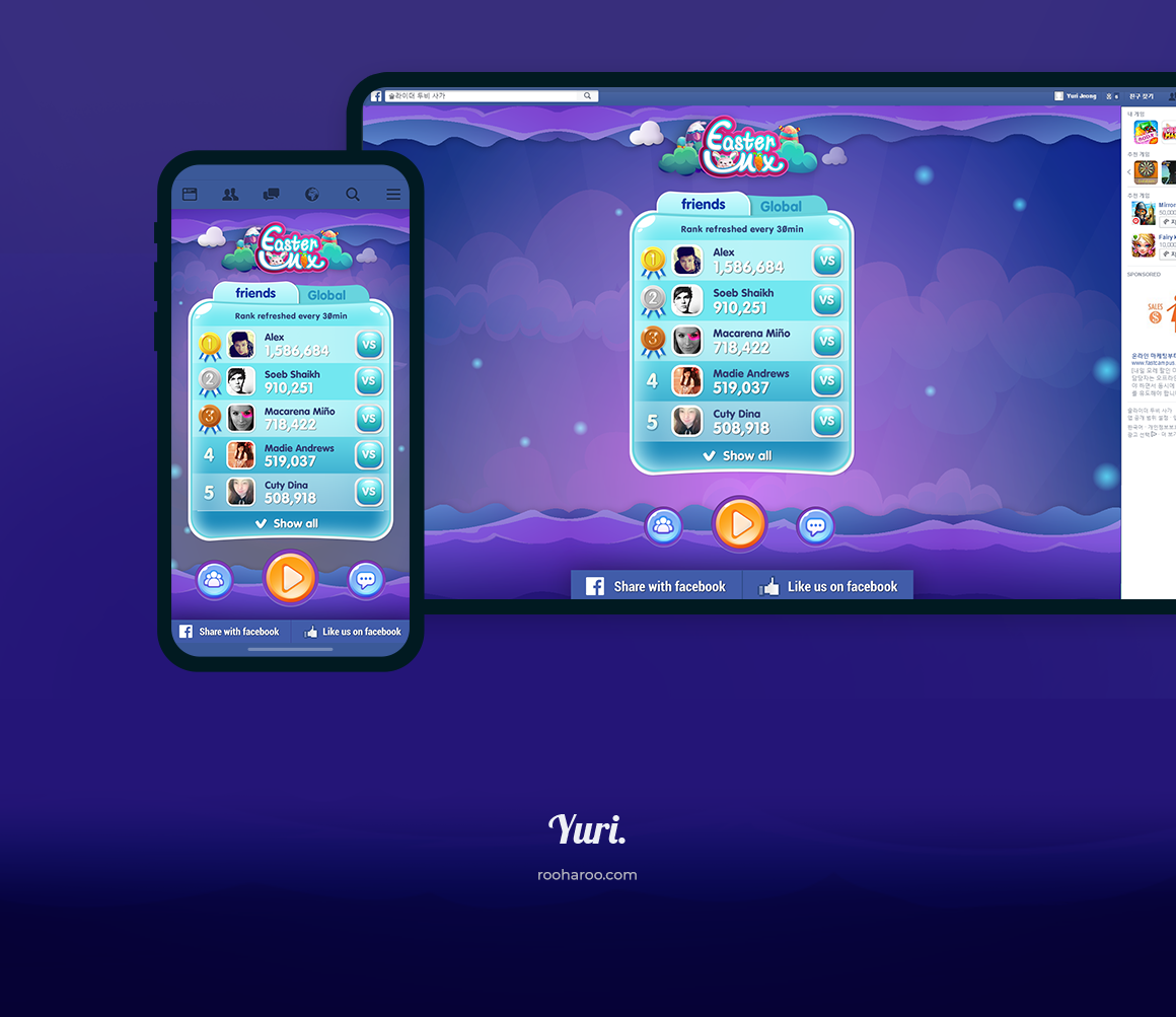 Match & Hatch 퍼즐게임의 이스터데이 버전입니다. 페이스북 게임용으로 제작되었고 로고 및 게임리소스(캐릭터/배경)를 활용하여 전체 UI 디자인 작업을 진행했습니다.